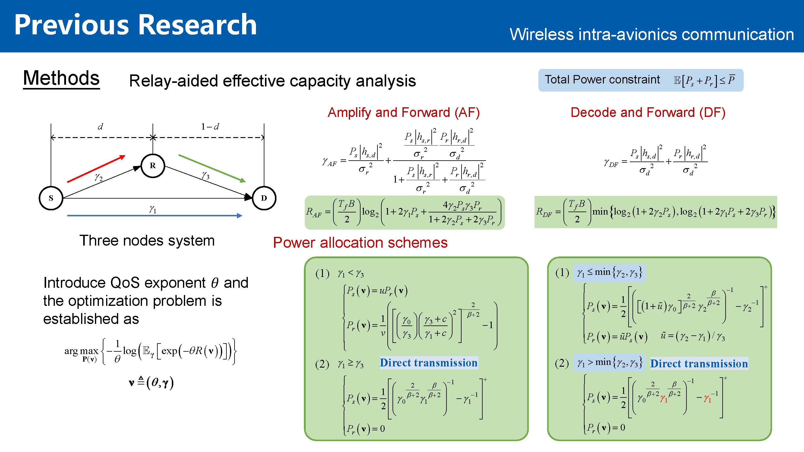 - Proposed a resource allocation scheme to solve the problem of maximizing the effective capacity of a single relay system (When the QoS exponent approaches infinity, the effective capacity degenerates to zero-outage capacity).